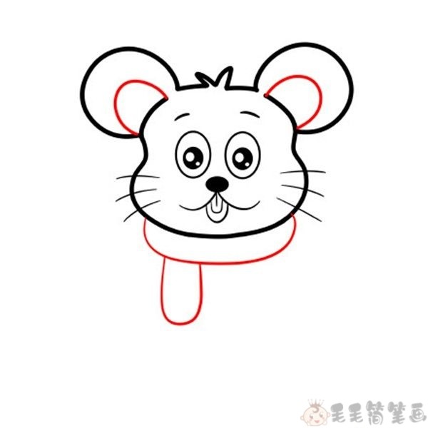 第四步:在围巾的下面画出老鼠的身体,因为这里我们所画的老鼠更偏向Q版简笔画老鼠,所以我们在处理老鼠的手、脚的时候是不用画得那么逼真的。