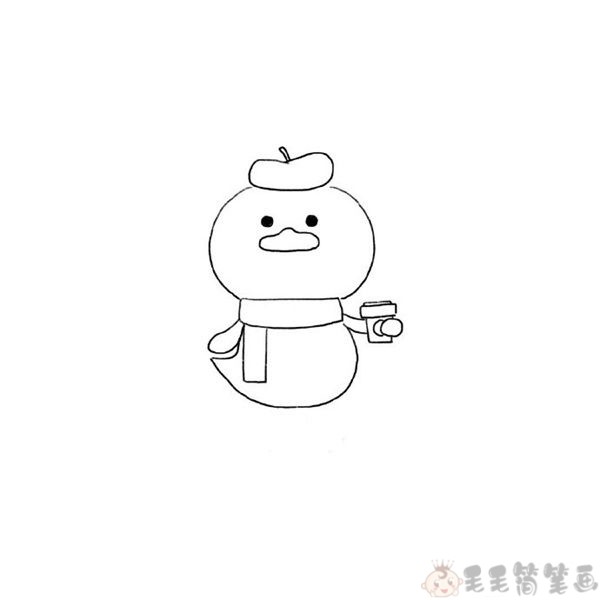 第二步:在上述步骤中我们画好的是小鸭的头部,这里我们就要在小鸭的头顶、头下分别画一顶帽子、一条围巾,这个帽子的形状被压瘪的苹果有些相似