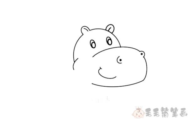 第二步:在之前留出的缺口处,补画上耳朵和鼻子,然后用一条弧线勾勒出河马的下颚
