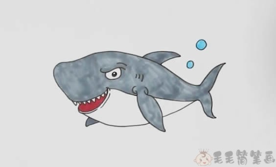 第三步:最后给鲨鱼涂上红红的大嘴巴,背部与鱼鳍都涂成灰色,一只凶猛的大鲨鱼简笔画就完成了