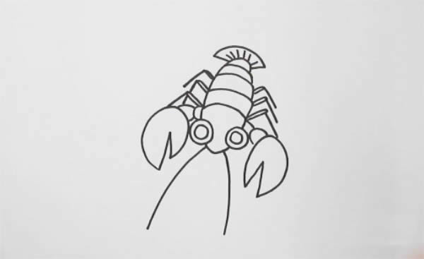先画出龙虾的眼睛,和倒三角形状的脑袋,接着在脑袋两边画出它的两只大钳子,然后往后画出长着一节又一节硬壳的身体,剩下的脚以及扇形尾巴,最后给它涂上红色,一只大龙虾就画好了。
