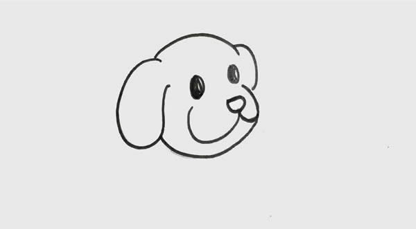 步骤一:先画出小狗的耳朵,往上画出小狗圆圆的脑袋,在上面画出眼睛、鼻子和嘴巴。画的时候要注意侧边小一点的耳朵。