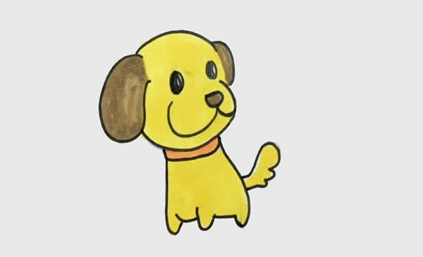 步骤四:最后给小狗的身体和尾巴涂上黄色,项圈涂上橙色,耳朵涂上褐色。一只漂亮又简单的小狗就画好了。