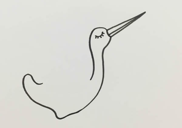 步骤一:画出仙鹤尖尖的嘴巴,往下再画出仙鹤的头,在头部中间画出仙鹤闭着的眼睛。仙鹤的头部大小比嘴巴稍微大一点。