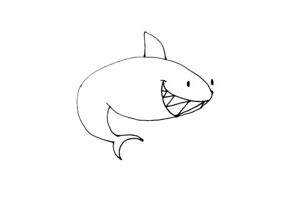 第七步:在鲨鱼的侧面画上它的鱼鳍,嘴的旁边再画上几道小弧线作鲨鱼的结构。