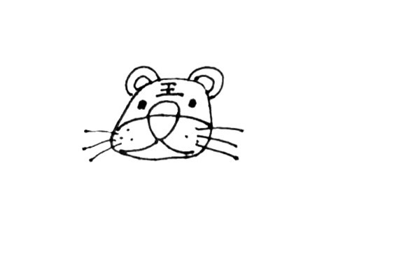 第三步:画上老虎的眼睛和耳朵,耳朵用两个半圆来表示就行,头上不要忘了加上它的标志。