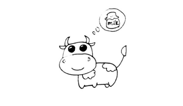 第五步:画上小奶牛的尾巴和身上的花纹,再画上一瓶牛奶。