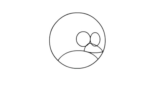 步骤二:画出小鸟的两个圆圆的眼框,两个眼眶紧紧的挨着,在 脸部的三分之一处左右画一条圆弧。