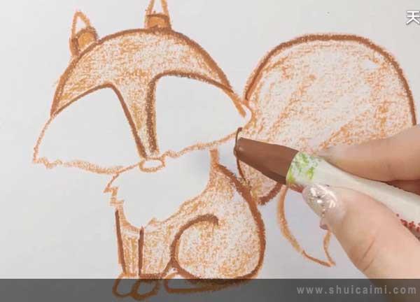 5、我们们用橙色蜡笔给松鼠上色,再用棕色蜡笔勾勒出线条。