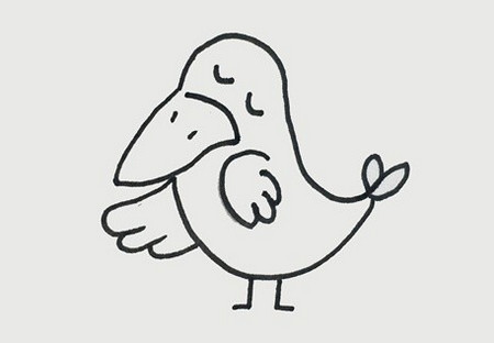先画出乌鸦扁扁的嘴巴,在嘴巴上面点两个点。往下画出乌鸦的身体,画身体的时候注意尾部变得越来越小