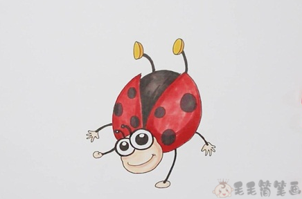 第四步:接下来将七星瓢虫的身体涂上深灰色,翅膀涂成红色,然后不断加深翅膀和身体的阴影颜色,简单的七星瓢虫简笔画就完成啦。