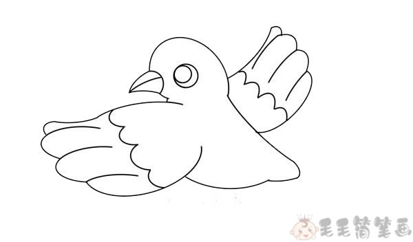 第二步:接着用一大一小的圆画出眼睛,再从上到下,从右到左的顺序勾勒出和平鸽的翅膀