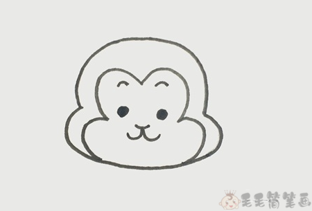 第一步:首先画出小猴子头部的轮廓,头顶圆一点,腮边稍微扁一点。在里面画出脸,上面像是个桃尖,再添上眉毛、眼睛、鼻子和嘴巴