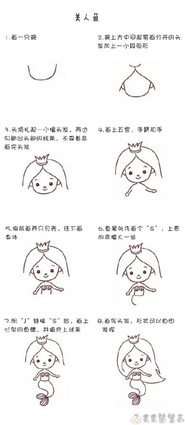 漂亮的美人鱼公主儿童简笔画步骤图: