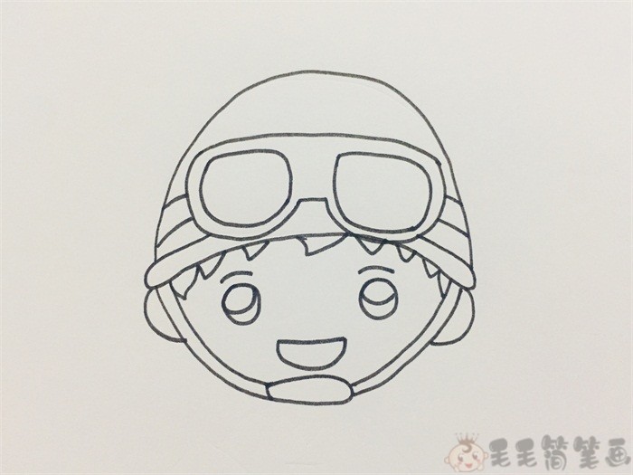 第一步:首先画出特种兵的头盔,画出头盔上的眼镜后,往下画出脸部轮廓与五官,并补充上刘海