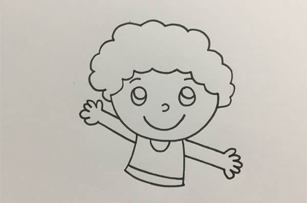 步骤二:然后往下画出小男孩的上半身衣服与两臂张开着的动作。