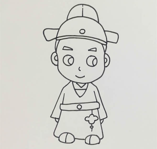 步骤二:接着往下画出诗人的上半身衣服,将衣领与腰带画出后,还要画出一块佩戴在腰间的玉佩。