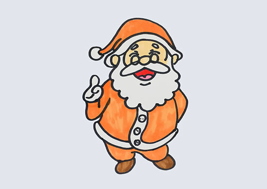先从圣诞老人的帽子和厚厚的胡须开始画,补充上他的五官后,往下画出圣诞老人的身体和四肢动作,最后用红色给帽子和衣服上色,鞋子涂上深棕色,皮肤涂上肤色,一个和蔼的圣诞老人就画好了。