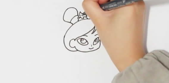 步骤一:先画出木兰的脑袋轮廓后,在脸上添上她的五官,接着画出头顶上的盘起发髻。