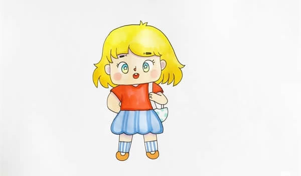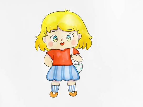 在白纸上画出漫画人物的脸型,接着依次画出耳朵和头发,然后是五官部分,往下画出身体,穿着t恤和短裙,往下是一双圆圆的鞋子,身上挂着一个包包,先给人物画上肤色,头发涂黄,再给五官上色,穿着红色的t恤和蓝色的裙子,再补充袜子和包包和颜色,漫画人物就完成了。