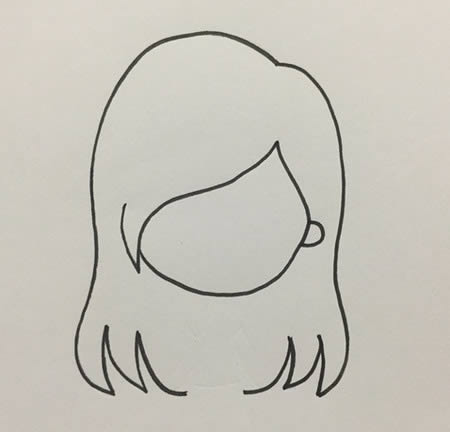 第一步:首先画出人物斜分样式的刘海,将头部的发型轮廓画完整后,画出她的面部线条与露出的一只耳朵。