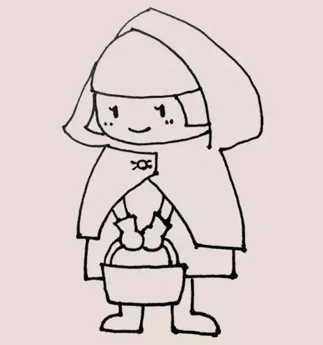 第五步:披风下画上小红帽戴手套的手,竖下来两条线,再画上手套。
