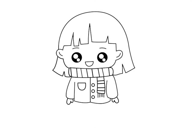 第三步:在围巾下面继续画出小女孩的上衣,上面有圆圆的纽扣和大大的口袋