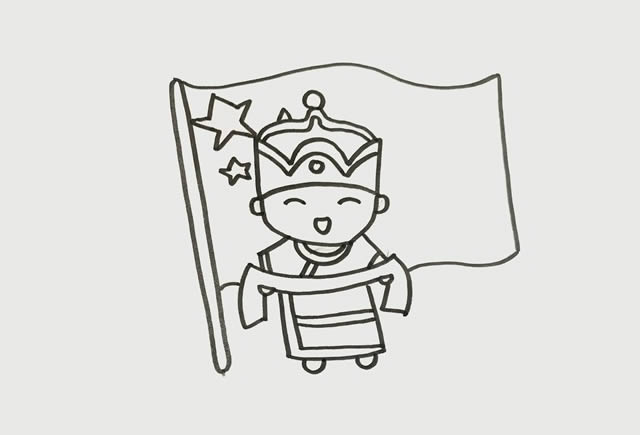 步骤一:在人物的背后画上一根旗杆后,画出旗面与上面的五星图案。