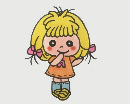 最后涂上颜色,把头发涂上黄色,袜子涂上天蓝色,蝴蝶结涂上玫红色,衣服涂上橙色,鞋子涂上黄色色,一个漂亮的萌女孩就画好了。