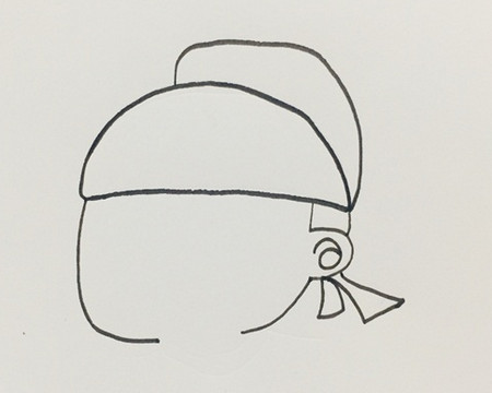 首先画出杜甫戴着的平式幞头,往下画出面部轮廓后,将鬓角、耳朵画出来,再来画出裹幞头扎在脑后的两角。