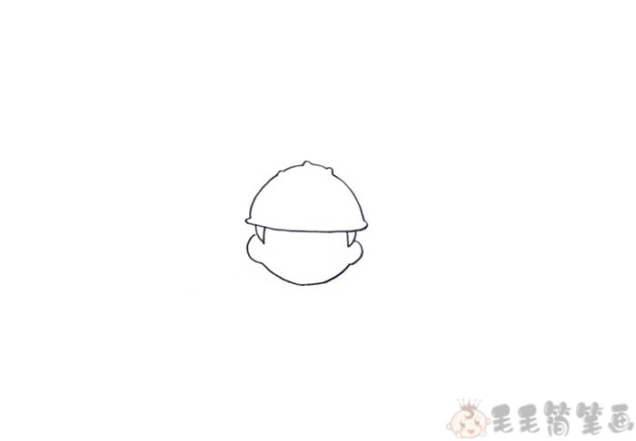第一步: 先画出工人半个圆形的帽子,在向下画出脸部轮廓,注意画出耳朵和露出来的头发。