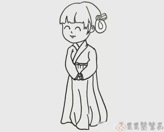 第二步:在脸上画出笑眯眯的眼睛、小巧的鼻子和嘴巴,往下画出衣襟,往下画出交叠在一起的衣袖,在手的附近画出腰带