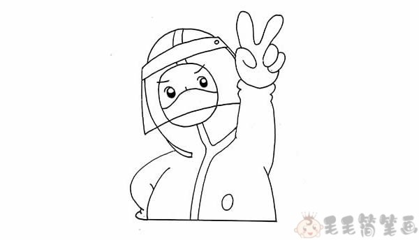 第五步:从下巴中间位置、脖子的位置和身体的中间位置画出防护服上的拉链痕迹,胸前画一个圆形的纽扣。