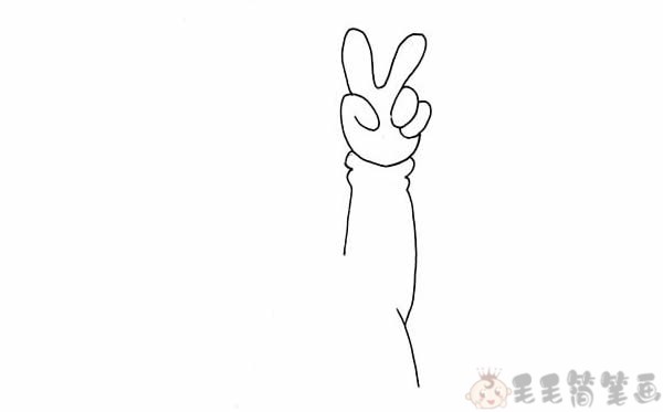 第一步:首先画出人物伸出的右手,先从竖起的食指和中指画起,再画出握成拳的手,接着从手掌出画出手臂上的袖子,注意画上一道褶皱。