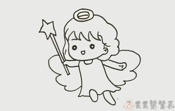 第三步:然后在天使的手中画出一根带着星星的手杖,在身后画出翅膀。一个小天使的形状就画好了