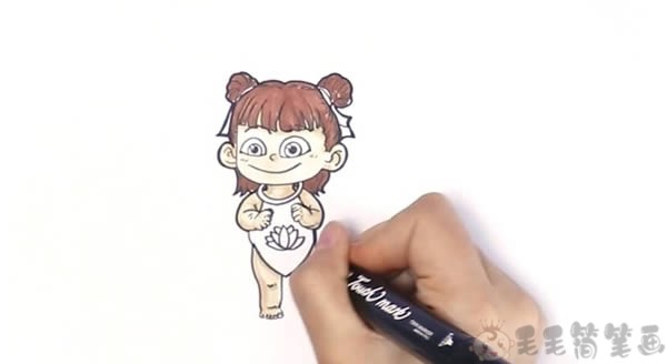 第四步:再给衣服和发带涂上红色,衣服上的莲花图案和脸蛋涂粉色,项圈涂成黄色,简单的哪吒简笔画就画好啦