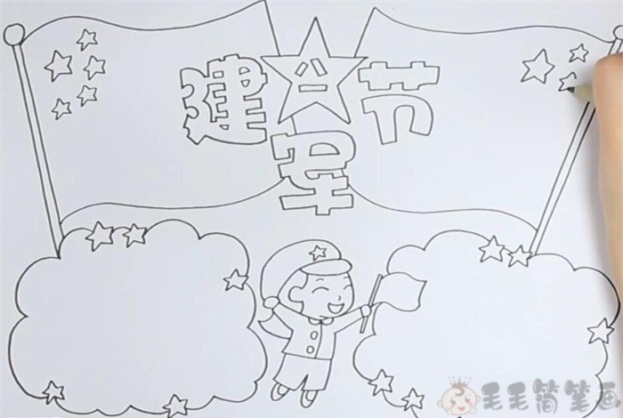 第一步:首先在中间写出“建军节”字样的报头与写着“八一”两个字的五角星,往下再画出一个穿着军装,举着红旗的小朋友。