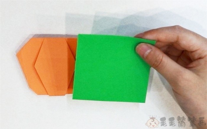 第六步:掀起一个角压折成四边形,把尖头往里、往外折叠两次,南瓜蒂就折好了