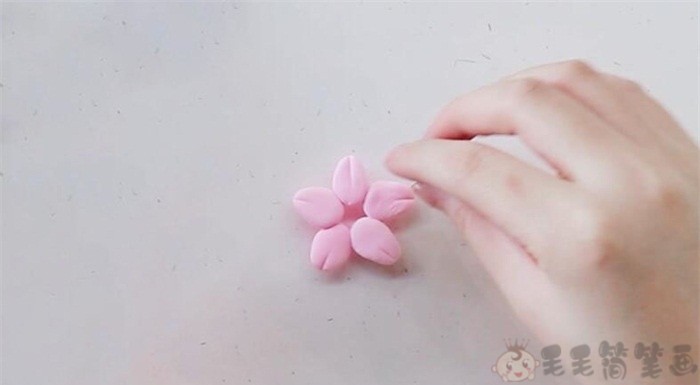 第三步:同样的再用粉色粘土做出粘连一圈的花瓣,并用小刀划出花瓣纹路线条