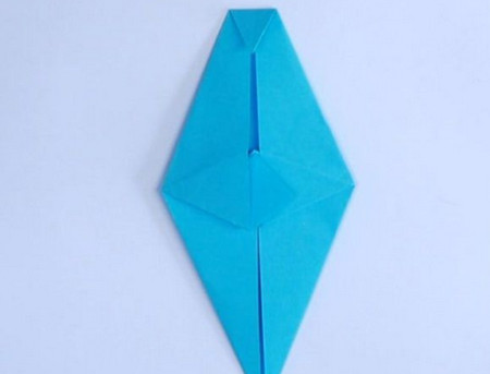 再接着将左右两侧依着中线,对称地往下翻折重合,往下折出一个小角的部位上压折出头部。