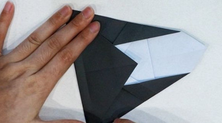3、翻面,两边对齐底层中线折叠,把另一边三角形往上折,压到里面去。