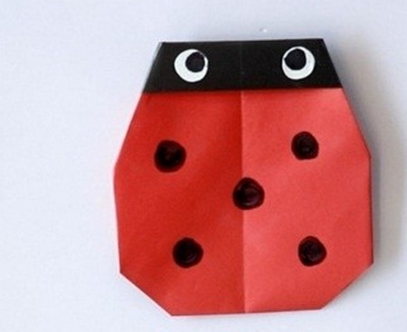 用白纸剪下两个圆,粘在瓢虫上面,画上眼珠,这样,一只简单的七星瓢虫就折好了