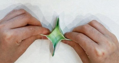 捏住四边往正方形中间挤压,在把外面四层纸依次撑开。