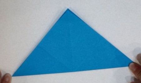 把正方形表层两个角打开压折下去,中间的尖角往左、右折出折痕,捏住折痕,使中间的角立起来。