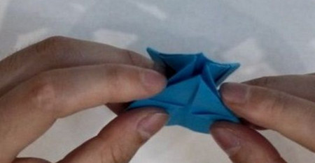 翻面捏住四个边往外翻折,把中间撑开,根据折痕,左右两边捏成千纸鹤的头和尾巴,这样,一个漂亮的千纸鹤盒子就折好了。