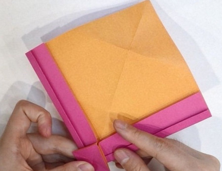把下面的角往反面折,翻面,下角和两边往里面折叠。