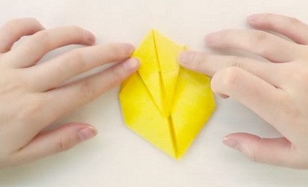 2、翻转到开口朝上的面,将其中一边的三角形两边向中线折叠,折出兔子的头部。