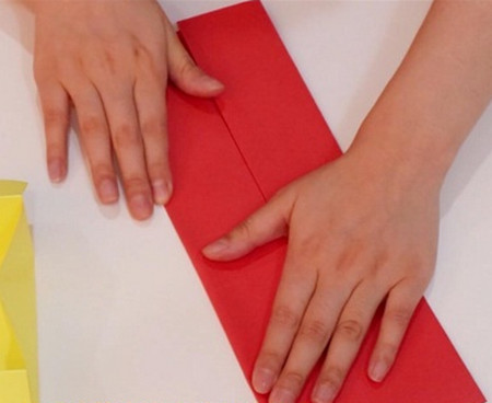 1、首先找一张大的长方形彩纸,将彩纸两次对折再打开。
