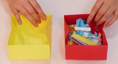 9、最后将折纸打开并放上一些纸屑,简单的垃圾桶就折好啦。