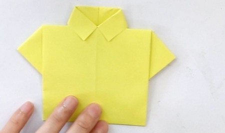 6、另一边也往里折叠,把多余部分剪掉,粘好,折成领带,把两部分组合在一起,一件纸衬衣就折好了。
